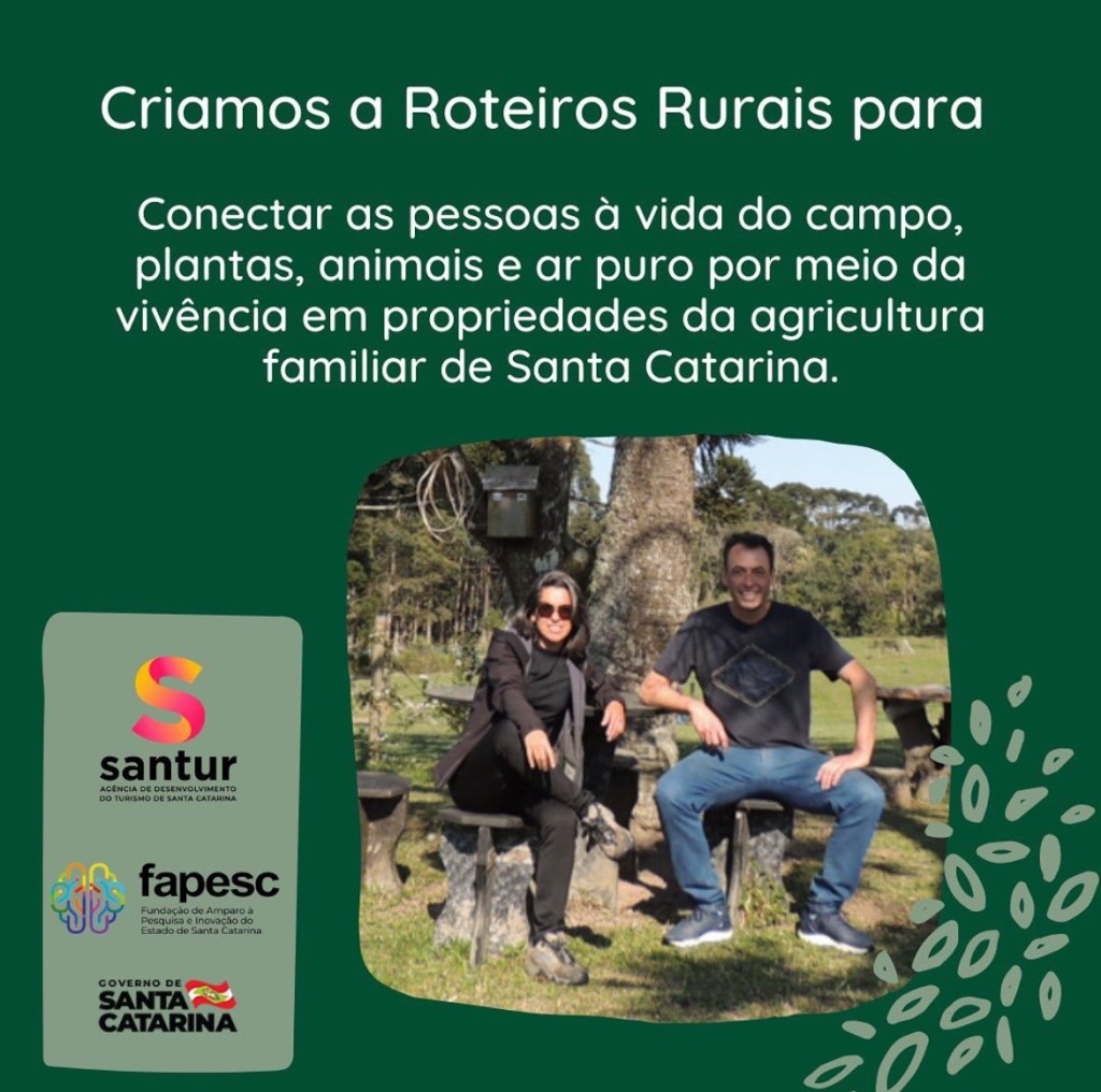 Aos poucos vamos te contando mais sobre a Roteiros Rurais, mas já vamos te contando que a plataforma veio para conectar as pessoas à vida do campo, plantas, animais e ar puro por meio da vivência em propriedades da agricultura familiar de Santa Catarina.